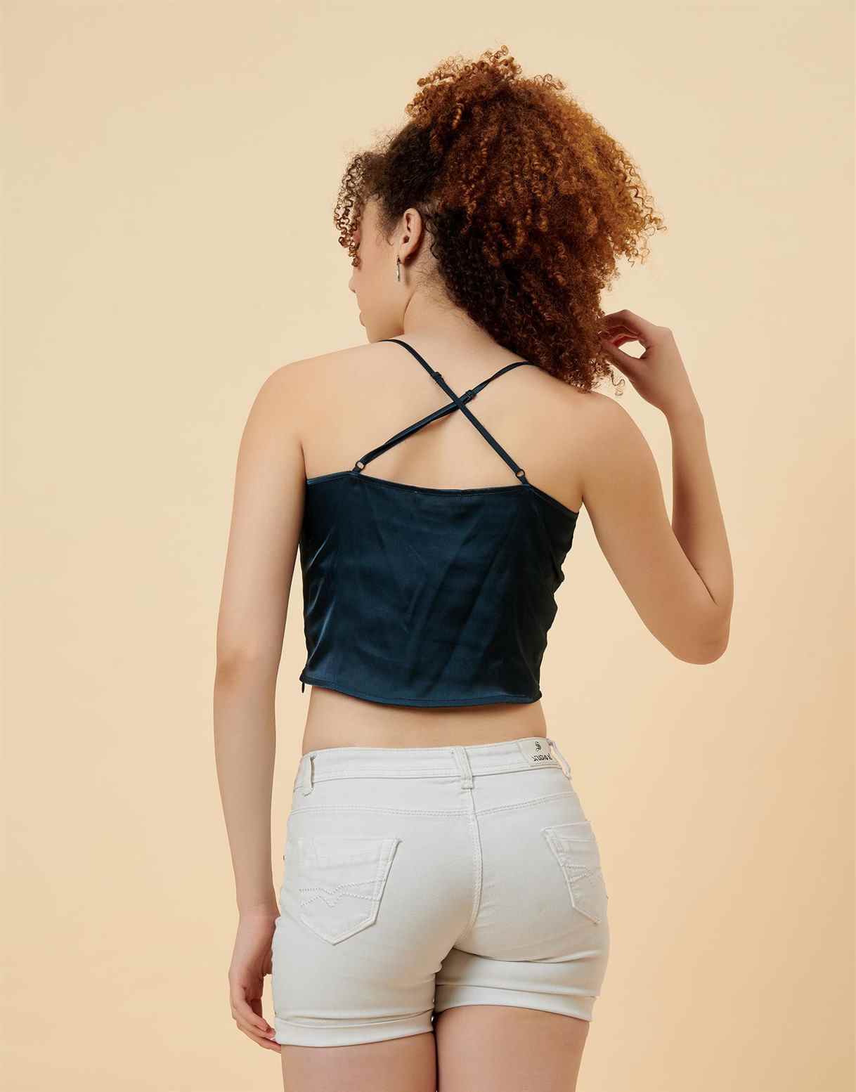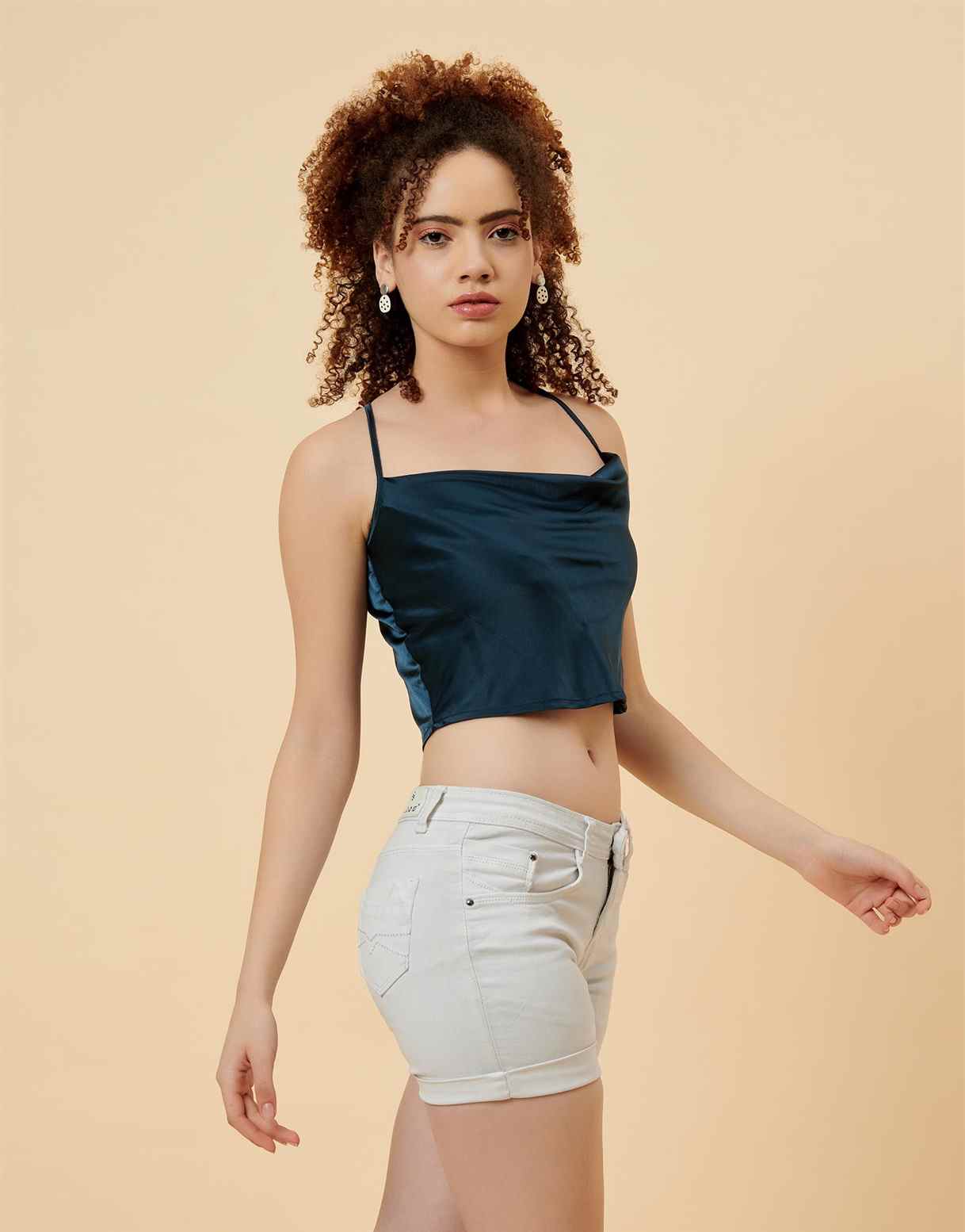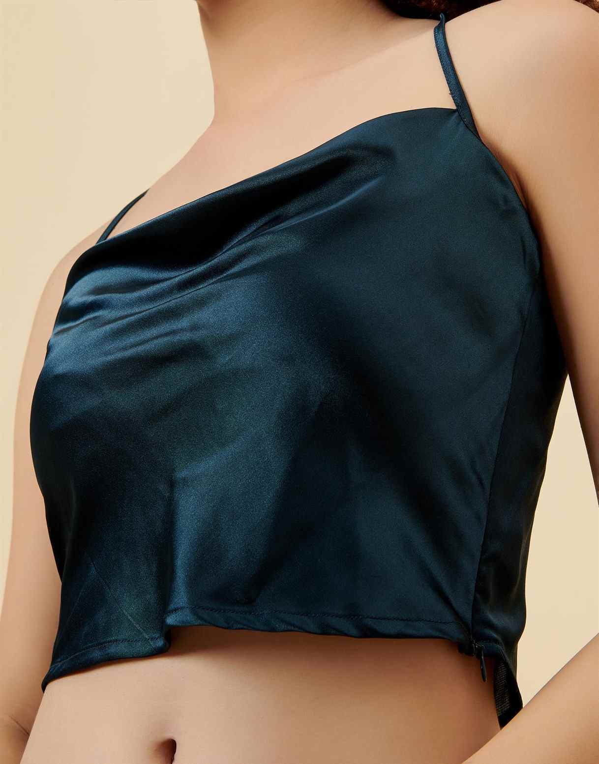 The blue crop top has strappy sleeves and cowl neck. The top has a wide neckline.