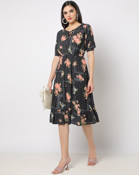 - Elevate your style with Nova Fashion’s FIG Floral Print Round Neck Fit & Flare Dress, the perfect choice for effortless elegance and timeless sophistication.