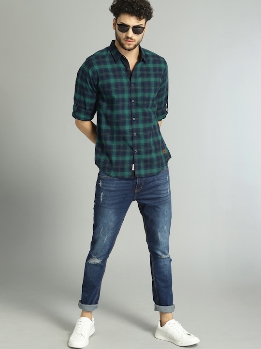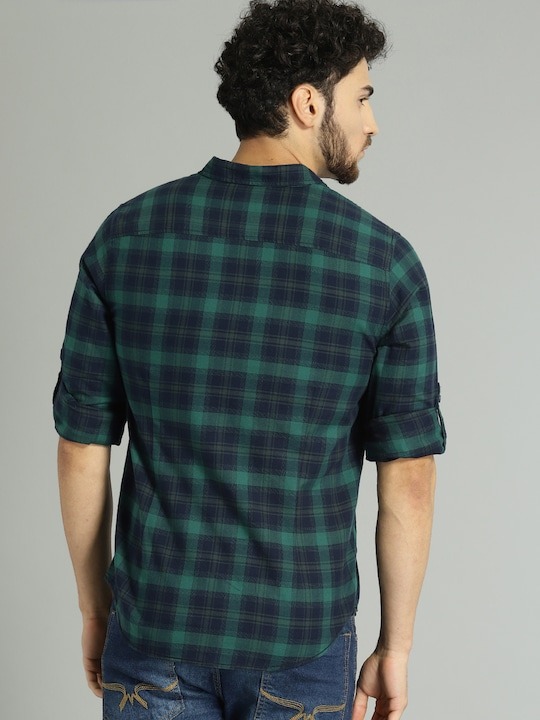 Men Green & Navy Blue Checked Casual Sustainable Shirt with classy aesthetics and you d get these flannels/checked shirts for men. This versatile piece can be worn on its own or as an overshirt. It is made of brushed fabric that has a cozy and posh feel. Featuring a modern silhouette that comes with drop shoulders and double chest pockets, the fit is one of the season s best men s checked shirts.