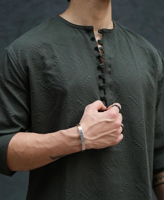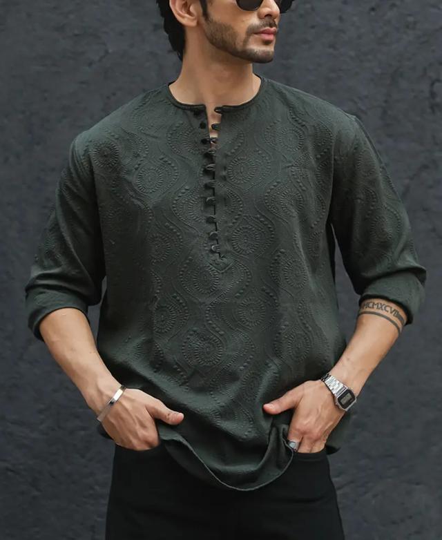 - Versatile Styling: Pair this Olive Green Structured Kurta Style Full Sleeves Shirt with trousers or jeans for a smart-casual look, or layer it under a blazer for a more formal ensemble.