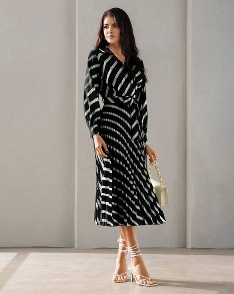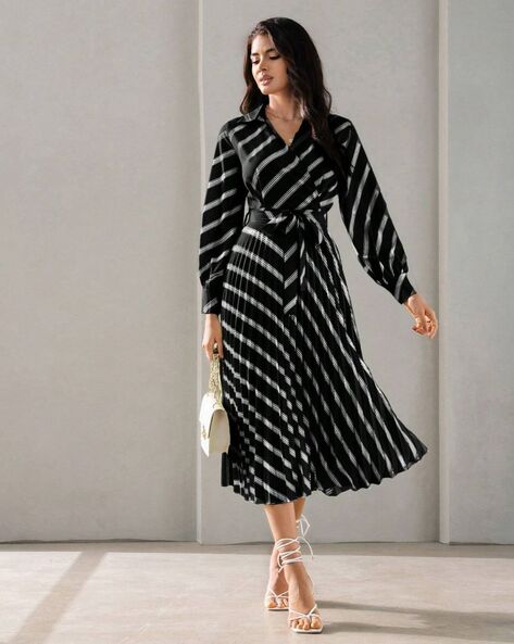 - Introducing Nova Fashion’s Wedani Stripes A-Line Dress, a classic and versatile piece for your wardrobe. This black dress with white stripes features an A-line silhouette and timeless design, making it suitable for various occasions from casual outings to semi-formal events.