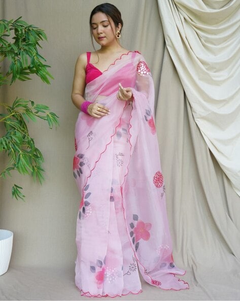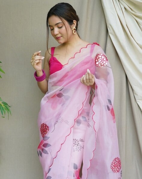 - Introducing Nova Fashion’s Sidyal Women Floral Embellished Organza Saree, an epitome of elegance and grace. This stunning pink saree features intricate floral embellishments and a luxurious organza fabric, making it an ideal choice for weddings, parties, and festive occasions.
