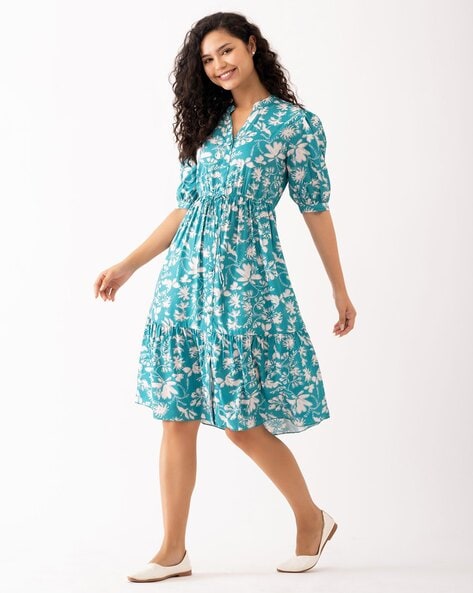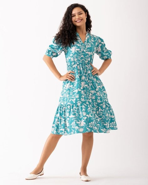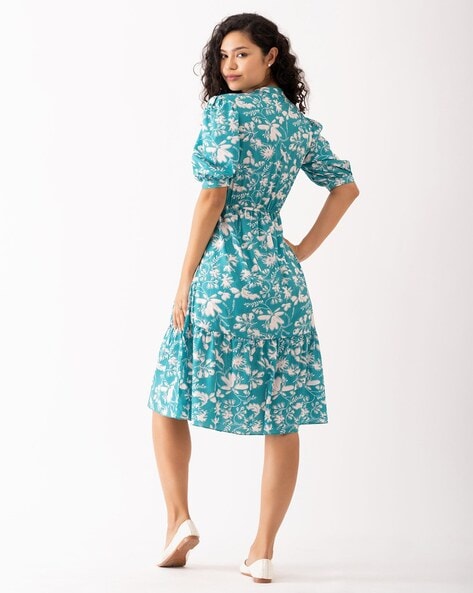 - Delightful Floral Print: The dress boasts an aqua hue adorned with a captivating floral print, adding a playful and dynamic touch to your look.