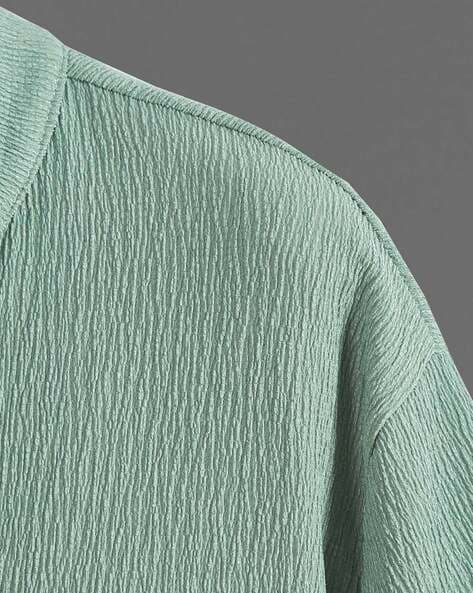 - Introducing the Wuxi Men Knitted Loose Fit Shirt with Mandarin Collar in a refreshing sea green hue, exclusively at Nova Fashion.
